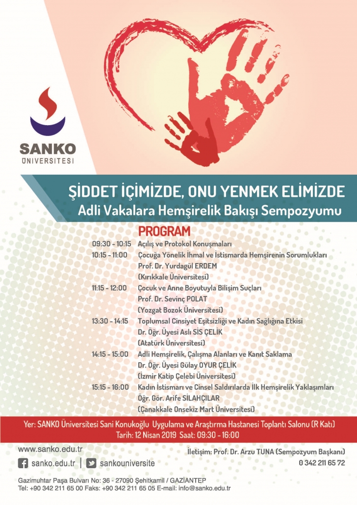 <p>SANKO Üniversitesi Sani Konukoğlu Uygulama ve Araştırma Hastanesi’nde, Sağlık Bilimleri Fakültesi Dekan Yardımcısı ve Hemşirelik Bölüm Başkanı Prof. Dr. Arzu Tuna’nın başkanlığında düzenlenecek sempozyumda Kırıkkale Üniversitesi’nden Prof. Dr. Yurdagül Erdem “Çocuğa Yönelik İhmal ve İstismarda Hemşirenin Sorumlukları”, Yozgat Bozok Üniversitesi’nden Prof. Dr. Sevinç Polat "Sharenting: Çocuk ve Anne Boyutuyla Bilişim Suçları”, Erzurum Atatürk Üniversitesi’nden Dr. Öğretim Üyesi Aslı Sis Çelik “Toplumsal Cinsiyet Eşitsizliği ve Kadın Sağlığına Etkisi”, İzmir Katip Çelebi Üniversitesi’nden Dr. Öğr. Üyesi Gülay Oyur Çelik “Adli Hemşirelik, Çalışma Alanları ve Kanıt Saklama” ile Çanakkale Onsekiz Mart Üniversitesi’nden Öğr. Gör. Arife Silahçılar “ Kadın İstismarı ve Cinsel Saldırılarda İlk Hemşirelik Yaklaşımları” konularına sunumlar gerçekleştirecek. <br />12 Nisan 2019 Cuma günü, 09.30 - 16.00 saatleri arasında düzenlenecek sempozyuma, dileyen herkes katılabilecek. </p>