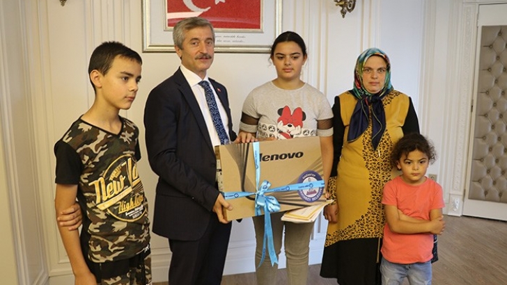 <p>Şahinbey Belediye Başkanı Mehmet Tahmazoğlu derslerinde üstün başarı gösteren yetim öğrenci Şükran Çiftçi’ye bilgisayar hediye etti. </p>