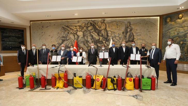 <p style="font-weight: 400; text-align: justify;">Protokol kapsamında Türkiye’de meydana gelen orman yangınlarının Gaziantep ili sınırları içerisinde de meydana gelme ihtimaline karşı, orman yangınları müdahale kapasitesini artırmak için şehrin kırsalında bulunan orman kenarındaki mahallelerde yaşayan vatandaşlara dağıtmak üzere bin 800 adet kauçuk şaplak, bin 750 adet çapalı tırmık ve 500 adet sırt tipi yangına müdahale tulumbası temin edilecek. Ayrıca orman yangınlarına müdahale eğitimi verilerek köy halkı ve muhtarlar arasında yangına karşı ortak bilinç oluşturulacak.</p>