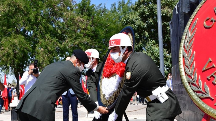 <p style="text-align: justify;">Vali Davut Gül, Garnizon Komutanı Tuğgeneral Osma, Büyükşehir Belediye Başkan Vekili Toprak, Muharip Gaziler ve Türkiye Harp Malulü Gaziler-Şehit Dul ve Yetimler Dernekleri tarafından Atatürk Anıtına çelenk sunulmasıyla başlayan tören, saygı duruşunda bulunulması ve İstiklal Marşı’nın okunması ile devam etti.</p>