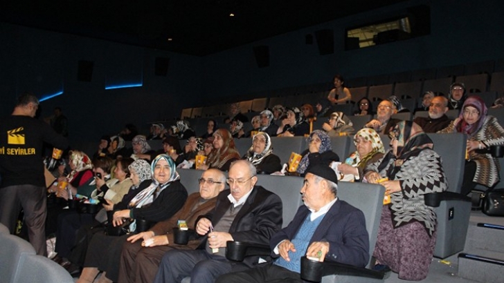 <p>65 yaş üstü 200 üye, tek tek duraklarından alınarak Nakıp Ali sinemasına getirildi. Yaşlılardan oluşan grup Antep Fıstığı isimli sinema filmini izledi. Katılımcıların bazıları gençlik yıllarını yâd ederken bazıları ise, ilk defa sinemada film izlemiş olduğunu belirterek mutluluklarını dile getirdi.</p>