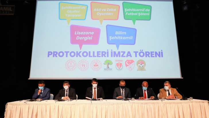 <p style="text-align: justify;">Şehitkamil Sanat Merkezi’nde (ŞSM) düzenlenen kurumlar arası işbirliği protokolleri imza törenine; Şehitkamil Kaymakamı Ömer Kalaylı, Şehitkamil Belediye Başkanı Rıdvan Fadıloğlu, Gençlik ve Spor İl Müdürü Muhittin Özbay, Şehitkamil İlçe Milli Eğitim Müdürü Mehmet Yağcı, TÜFAD Başkanı İsmet Savcılıoğlu, Gaziantep Amatör Spor Kulüpleri Federasyonu Genel Sekreteri Güngör Sönmez ile TFF Gaziantep İl Temsilcisi Vahdettin Balsu katıldı. Şehitkamil’deki öğrencileri ve gençleri yakından ilgilendiren 5 protokol, sırasıyla ilgili kurumun temsilcisi tarafından imzalandı.</p>