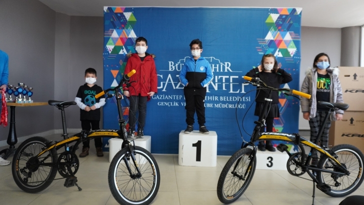 <p style="font-weight: 400; text-align: justify;">Gaziantep Büyükşehir Belediye Başkanı Fatma Şahin’in ‘Çocuklar ve gençlerin bir cevher, ne kadar işlersek geleceğimiz o kadar aydınlanır’ sözlerinden hareketle çalışmalarını sürdüren Gençlik Hizmetleri ve Spor Daire Başkanlığı, organize ettiği 25 Aralık Online Satranç Turnuvası’nda kazananlara hediyelerini vermek için Mehmet Şimşek Tenis Kompleksi’nde ödül töreni organize etti. 8 Yaş ve Altı Kategorisi, 10 Yaş ve Altı Kategorisi, 12 Yaş ve Altı Kategorisi ve Açık Kategori olmak üzere toplam 4 kategoride 128 yarışmacı turnuvaya katılım sağladı. Dereceye giren ilk 3 isme kupa, madalya ve bisiklet verildi.</p>