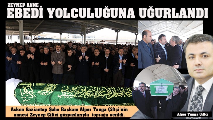 <p>ASKON Gaziantep Şube Başkanı Alper Tunga Çiftçi’nin annesi Zeynep Çiftçi’nin cenazesi, Gaziantep’te toprağa verildi. 69 yaşında vefat eden Zeynep Çiftçi için Bahaeddin Nakıboğlu Camisi'nde tören düzenlendi.</p> <h2 class="lead"> </h2> <p>Askon Gaziantep Şube Başkanı ve Artıhaber gazetesi İmtiyaz sahibi Alper Tunga Çiftçi’nin annesi Zeynep Çiftçi gözyaşlarıyla toprağa verildi. Gaziantep Bahaddin Nakıpoğlu Cami’inde kılınan öğle namazına müteakip Asri Mezarlığı’na dualarla ve gözyaşlarıyla defnedildi. Zeynep Çiftçi’nin yakınları taziyeleri kabul ederken uzun kuyruklar oluştu. Çiftçi ailesi taziyelerini İpek yolu üzerindeki Hürriyet Sosyal tesisi taziye evinde kabul edecek.Törene,  Şahinbey Belediye başkanı Mehmet Tahmazoğlu,AK Parti İl Başkanı Eyup Özkeçeci, AK Parti Şahinbey İlçe Başkanı Hasan Teke, AK Parti Şehitkamil İlçe Başkanı Mehmet Yılmaz, Gaziantep Küçük Sanayi Sitesi Yapı Kooperatifi Başkanı Mustafa Kemal Güneş, Gaziantep Esnaf ve Sanatkarları Odaları Birliği Başkanı Ömer Küsbeoğlu, Gaziantep Gazeteciler Cemiyeti Başkanı İbrahim Ay ve yakınları ile iş dünyasından çok sayıda kişi ve vatandaşlar katıldı.</p>
