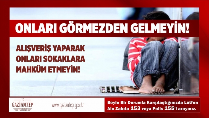 <p>5442 sayılı  İl İdaresi Kanunu uyarınca Gaziantep Valiliği tarafından, Sokağın Tehlikelerine Maruz Kalan Çocukların Korunması ile ilgili yayınlanan genelge kapsamında Valilik ve Büyükşehir Belediyesi ortak çalışmasıyla Şehrin billboardlarına afişler yerleştirildi. Yerleştirilen bilgilendirme görselleri ile çocuk işçiliğine karşı farkındalık oluşturulması planlanıyor.</p> <p>“Onları Görmezden Gelmeyin”, “ Çocukların Yeri sokaklar Değil Dersliklerdir” ve “ Alışveriş Yaparak Onları Sokaklara Mahkum Etmeyin” sloganlarının kullanıldığı billboard tanıtım çalışmasında ayrıca böyle bir durum ile karşılaşıldığında 153 Zabıta ve 155 Polis İmdat hatlarına şikayette bulunulması isteniyor.</p> <p>Sokakta yaşayan ve çalıştırılan çocukların durumu ile ilgili takibatı da yine Valilik tarafından kurulan komisyon yürütecek.  </p>