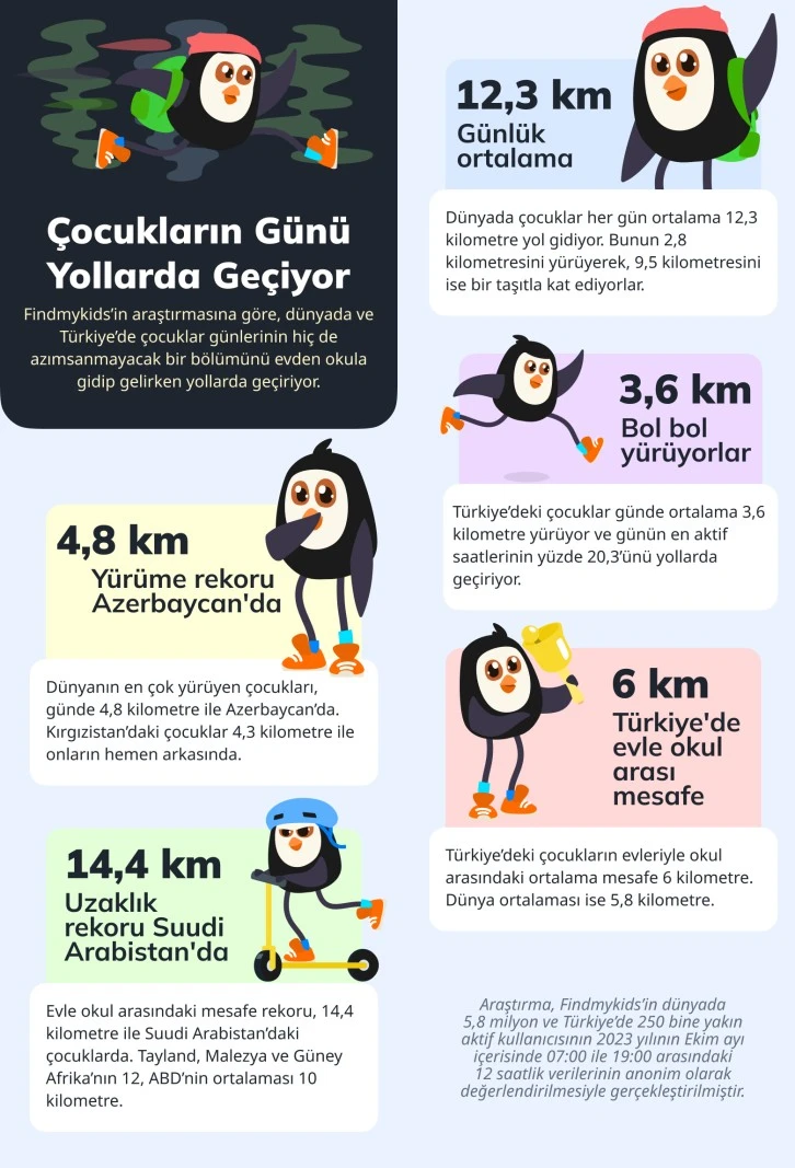 Konum takip uygulaması Findmykids, dünyada ve Türkiye’deki çocukların her gün ev dışında ortalama ne kadar yol gittiğini ölçtü. Findmykids’in dünyada 5,8 milyon ve Türkiye’de 250 bine yakın aktif kullanıcısının geçtiğimiz Ekim ayı içerisinde 07:00 ile 19:00 arasındaki 12 saatlik verilerini anonim olarak değerlendirdiği araştırmaya göre, çocuklar günlerinin hiç de azımsanmayacak bir bölümünü evden okula gidip gelirken yolda geçiriyorlar. Findmykids verilerine göre dünyadaki çocuklar her gün ortalama 12,3 kilometre yol gidiyor. Bunun 2,8 kilometresini yürüyerek, 9,5 kilometresini ise bir taşıtla kat ediyorlar. Araştırmaya göre dünyanın günde en çok yürüyen çocukları Azerbaycan’da. Findmykids araştırması Azerbaycan’daki çocukların günde ortalama 4,8 kilometre, Kırgızistan’dakilerin 4,3 kilometre, Hindistan’dakilerin 3,8 kilometre ve Türkiye’deki çocukların ise günde ortalama 3,6 kilometre yürüdüğünü ortaya koyuyor. Almanya ve Rusya’nın ortalaması 2,6 kilometre, İngiltere’nin ortalaması 2,2 kilometre ve çocukların en az yürüdüğü ülke olan ABD’nin ortalaması ise 1,6 kilometreyle Türkiye’nin yarısından az.
