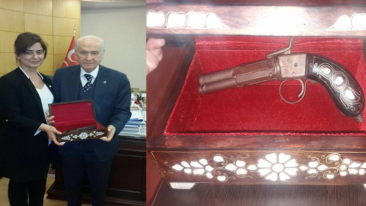 <p>Milliyetçi Hareket Partisi Genel Başkanı Devlet Bahçeli’nin, TBMM Grup Toplantısında yaptığı konuşmayı dinleyen Canpolat, Genel Merkeze giderek Bahçeli’yi makamında ziyaret etti. Ziyarette Gaziantep Savunmasında kullanılan bir tabancayı sedef kaplamalı sandıkta Bahçeli’ye takdim eden Canpolat, “Genel Başkanım bizlerde gerektiğinde milliyetçi kadınlar olarak sizinle Afrin’e gitmeye taşıdığımız bu canı bu vatana vermeye hazırız” dedi.<br />MHP Genel Başkanı hediye edilen tabancayı inceleyerek çok beğendiğini ifade etti. Gaziantep'e de selam gönderen Bahçeli, Canpolat’a sık sık ziyaretine beklediğini belirtti.</p> <p>Canpolat ziyaret çıkışında Grup Toplantısında Bahçeli’nin yaptığı konuşmadan esinlenerek, “Türk milliyetçileri için hedef, Kızılelma ülküsüdür, hedef Türkiye'nin muasır medeniyetler seviyesine öz değerleriyle ulaşmasıdır. Biz Gaziantepliler vatan savunmasının ne demek olduğunu çok iyi biliyoruz. Tarih sayfalarına baktığınızda Adımızın baş harfini GAZİ- Antep okuduğunuzda da bunu görürsünüz. Sayın liderimizin karşısında o kadar çok heyecanlandım ki anlatamam! Bu heyecan Bilge liderim Devlet Bahçeli’ye ve davamıza ömür boyu taşıyacağımız sadakat madalyamızdır. Ülküsü ve ülkesi olmayanlar bu sadakati anlayamazlar. Bizim inancımız tam Ülkümüz KIZILELMA’dır. Gerekirse liderimizin arkasından Kızılelma Afrin ise Bozkurt yaparak Afrin’e kadar gideriz” diye konuştu.</p>