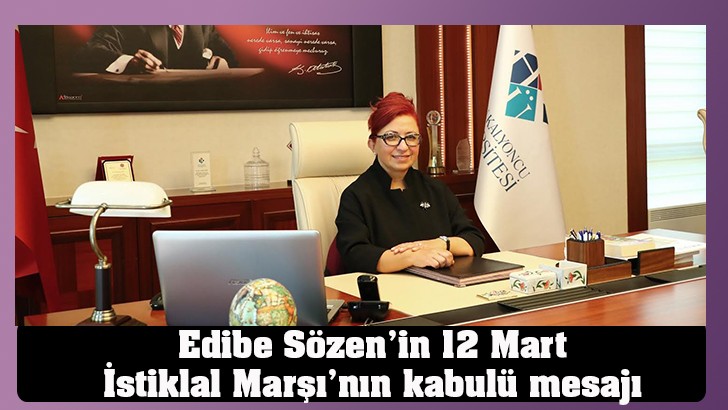 <p>Hasan Kalyoncu Üniversitesi (HKÜ) Rektör V. Prof. Dr. Edibe Sözen, 12 Mart İstiklal Marşı’nın Kabulü ve Mehmet Akif Ersoy’u Anma Günü nedeniyle bir mesaj yayımladı. </p> <p>İstiklal Marşı’nın Kabulünün 98. yıl dönümünde bağımsızlık ve mücadele ruhuna vurgu yapan Rektör Sözen mesajında, ‘‘Tüm Türkiye’de büyük küçük her kesimin hafızalarına kazınan İstiklal Marşı’nın her mısrasında vatan ve bağımsızlık tutkusu, birlik ruhu ve kahramanlık destanı yankılanmaktadır. Aziz milletimiz, milli birlik ve beraberliği, demokrasi ve bağımsızlığımızı her zaman en kadim emanet bilerek her türlü dış tehdit karşısında el ele vermiştir. Mehmet Akif Ersoy’un, 'Allah bir daha bu millete İstiklal Marşı yazdırmasın' cümlesi, savaş şartlarının ne kadar ağır olduğunu bizlere en derinden hissettirmektedir. Vatan şairimiz Mehmet Akif Ersoy halk ile iç içe mütevazı yaşamı, duruşu, cesareti ve aydın kişiliği ile örnek bir şahsiyettir. Kaleminden dökülen mısralarla halkın sesi olan İstiklal Şairimiz, memleketimizin önemli örnek şahsiyetlerindendir” dedi. <br />Sözen mesajının sonunda ise, “İstiklal Marşı’mızın kabulünün 98. yıl dönümünde aziz milletimizin kahramanlığına ve istiklal mücadelesine kalemiyle ruh ve vücut kazandıran Milli Şairimiz Mehmet Akif Ersoy’u ve İstiklal mücadelemizin tüm kahramanlarını saygı, şükran ve rahmetle anıyorum’’ diye konuştu. </p>