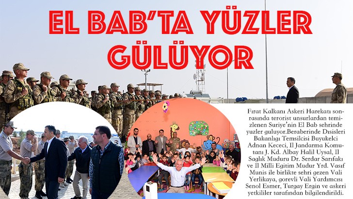 <p>Fırat Kalkanı Askeri Harekatı sonrasında terörist unsurlardan temizlenen Suriye’nin El Bab şehrinde yüzler gülüyor.Beraberinde Dışişleri Bakanlığı Temsilcisi Büyükelçi Adnan Keçeci, İl Jandarma Komutanı J. Kd. Albay Halil Uysal, İl Sağlık Müdürü Dr. Serdar Sarıfakı ve İl Milli Eğitim Müdür Yrd. Vasıf Munis ile birlikte şehri gezen Vali Yerlikaya, görevli Vali Yardımcısı Şenol Esmer, Turgay Ergin ve askeri yetkililer tarafından bilgilendirildi.</p>