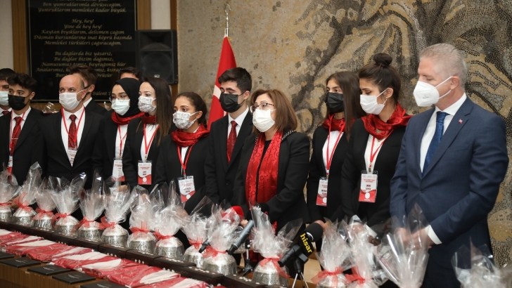 <p style="font-weight: 400; text-align: justify;">Cumhurbaşkanı Recep Tayyip Erdoğan’ın tensipleriyle Cumhurbaşkanlığı himayelerine alınan Gaziantep’in Kurtuluşu’nun 100’üncü Yılı Etkinlikleri kapsamında Kültür ve Turizm Bakanlığı katkılarıyla, Gaziantep Valiliği, Gaziantep’i Geliştirme Vakfı’nın (GAGEV) koordinasyonunda, Büyükşehir Belediyesi Kültür ve Turizm Daire Başkanlığı organizasyonunda “Gaziantep Şiarı Projesi” lansmanı yapıldı. Proje kapsamında 22 öğretmen ve öğrencinin Türkiye’nin 80 iline götürecekleri toprak ve bayrak, Gaziantep Valiliği Fuaye Alanı’nında düzenlenen törenle Gaziantep Büyükşehir Belediye Başkanı Fatma Şahin ve Gaziantep Valisi Davut Gül tarafından teslim edildi.<strong> </strong></p>
