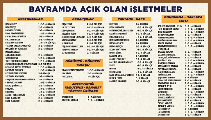 Kurban Bayramı tatili süresince Gaziantep'te bulunacak vatandaşlar ve şehir dışından gelen yerli ve yabancı misafirler için hizmet verecek işletmeler belirlendi.