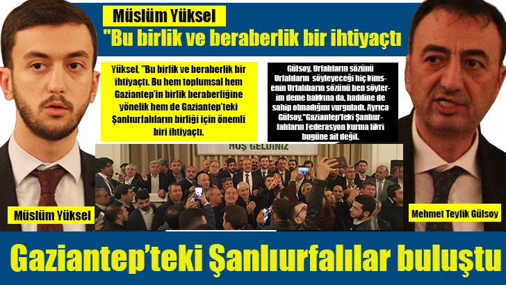 <p>Gaziantep’te yaşayan Şanlıurfalıların yer aldığı 6 derneğin birleşimi ile oluşan Şanlıurfa Dernekleri Fedarasyonu, üyeleri ile bilgilendirme toplantısı yaptı. Kurucu Federasyon başkanı Prof. Dr. Teyfik Gülsoy , Federasyonun kuruluş amacı ve hedefleri ile ilgili bilgi verdi. Ayrıca, Urfalıların sözünü Urfalıların söyleyeceği hiç kimsenin Urfalıların sözünü ben söylerim deme hakkına da, haddine de sahip olmadığını da vurguladı. Toplantıya AK Parti Gaziantep Milletvekili Müslüm Yüksel de katıldı.</p>
