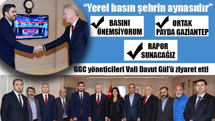 <div>Gaziantep Gazeteciler Cemiyeti (GGC) Başkanı İbrahim Ay ve Yönetim Kurulu Üyeleri, Vali Davut Gül’ü ziyaret ederek, yeni görevinde başarılar diledi.</div> <div> </div> <div>BASINI ÖNEMSİYORUM</div> <div> </div> <div>Gaziantep’in yeni Valisi Davut Gül, GGC yöneticilerini samimi bir ortamda ağırlarken, yerel basını önemsediğini söyledi. Gaziantep’te görev yapıyor olmaktan gurur duyduğunu ifade eden Vali Gül, “Yerel basının önemini ve yaşadığı sorunları biliyorum. Basını önemsiyoruz. Çünkü yerel basın bir şehrin aynasıdır. Yöneticilerle halk arasında köprü vazifesi gören yerel basının güçlü olması gerekir. Bizler sizlerin sayesinde kendimizi halka anlatıyoruz. Hep birlikte şehrimizin kalkınması ve gelişmesi için çalışacağız” şeklinde konuştu. </div> <div> </div> <div>ORTAK PAYDA GAZİANTEP</div> <div> </div> <div>Gaziantep Gazeteciler Cemiyeti Başkanı İbrahim Ay, ziyaret sırasında, Vali Gül’e Gaziantep basını ve Gaziantep Gazeteciler Cemiyeti’nin çalışmaları ile ilgili bilgi verdi. Başkan Ay, şöyle dedi: “Öncelikle yeni görevinizde başarılar diliyoruz. Bizim ortak paydamız Gaziantep’tir. Gaziantep’in faydasına olan her konuda, sizlerle birlikte çalışmaktan, işbirliği yapmaktan mutluluk duyarız.” </div> <div> </div> <div>RAPOR SUNACAĞIZ </div> <div> </div> <div>GGC yöneticilerine ziyaretlerinden dolayı teşekkür eden Vali Gül, Gaziantep’i tanımaya çalıştığını, bir taraftan da iadeyi ziyaretlere başladığını söyledi. Vali Gül, Gaziantep Gazeteciler Cemiyeti’ni ziyaret ederek basın mensupları ile bir araya gelmek istediğini belirtirken, Başkan İbrahim Ay da, basının sorunları ile ilgili hazırlayacakları geniş kapsamlı raporu önümüzdeki günlerde Vali Gül’e sunacaklarını sözlerine ekledi.</div>