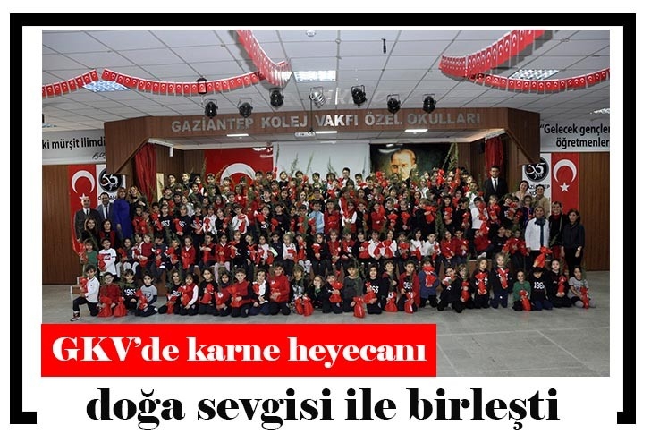 <p>Bir dönemi daha geride bırakırken yüzlerce GKV İlkokul öğrencisi, öğretmeni ve velisi hep beraber karne heyecanı yaşadı. 2018-2019 eğitim öğretim yılının birinci yarıyılı Gaziantep Kolej Vakfı Özel İlkokulu’nda düzenlenen karne töreniyle sona erdi. Türkiye genelinde milyonlarca öğrenci karne alırken GKV Özel İlkokulunda 1.sınıf öğrencileri karne coşkusunu, doğa sevgisi ile birlikte yaşadı. </p>