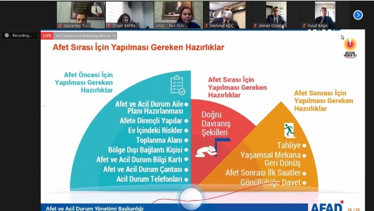 <p style="font-weight: 400; text-align: justify;">Toplumda afet bilincinin geliştirilmesi amacıyla online düzenlenen eğitimde, afet öncesi, afet sırasında ve sonrasında yapılması gereken hazırlıklar hakkında bilgiler verildi. </p> <p style="font-weight: 400; text-align: justify;">GTB üyeleri, personelleri ve çeşitli STK’lardan temsilcilerin yer aldığı eğitim programının açılışında konuşan GTB Genel Sekreteri Özgür Bayram, toplumsal farkındalık oluşturmak amacıyla afetler olmadan alınması gereken tedbirler hakkında bilgilendirme eğitimi gerçekleştirmek istediklerini söyledi. </p> <p style="font-weight: 400; text-align: justify;">Eğitim programının temel amacının başta deprem olmak üzere ülkemizde görülen afetlere yönelik yapılacak doğru davranışları bireylere kazandırmak olduğunu kaydeden Bayram, “2020 yılı afetler ve özellikle deprem açısından Türkiye adına üzücü bir yıl olarak geride kaldı. Olası risklere karşı korunmak ve almamız gereken tedbirler açısından bu tarz eğitimler toplumsal bilinçlenme adına büyük önem arz etmekte” diye konuştu.  </p> <p style="font-weight: 400; text-align: justify;">Gaziantep İl Afet ve Acil Durum Müdürlüğü Eğitim Görevlisi Peri Güvenir ise eğitim programında afet öncesi, sırasında ve sonrasında alınacak tedbirler hakkında katılımcılara bilgiler verdi. </p> <p style="font-weight: 400; text-align: justify;">2021 yılının afet farkındalık eğitim yılı olarak ilan edildiğini anımsatan Güvenir, bu anlamda eğitim programlarını daha yaygın hale getirmeye çalıştıklarını ifade etti. </p> <p style="font-weight: 400; text-align: justify;">Afetin, toplumun tamamını veya belli kesimleri için fiziksel, ekonomik sosyal kayıplar doğuran ve normal hayatı insan faaliyetlerini durduran veya kesintiye uğratan, etkilenen toplumun baş etme kapasitesinin yeterli olmadığı doğa, teknoloji ve insan kaynaklı olaylar olduğunu belirten Güvenir, “Afet bir olayın kendisi değil, doğurduğu sonuçtur” dedi. </p> <p style="font-weight: 400; text-align: justify;">Afet ve acil durumlara karşı yapılması gereken hazırlıklar hakkında bilgiler veren Güvenir, konuşmasını şöyle sürdürdü: </p> <p style="font-weight: 400; text-align: justify;">“Afet öncesi hazırlıklarda bizim öncelikle bilgilenmemiz gerekiyor. Planlama yapmamız ve hazırlıklarımızı tamamlamamız gerekiyor. Afet öncesi hazırlıklarda afet ve acil durum aile planı hazırlamamız, afete dirençli yapılarımızın olması gerekiyor. Bunların yanı sıra, ev içindeki riskleri belirlememiz ve riski kaynağından çözmemiz gerekiyor. Afet ve acil durum bilgi kartı ve afet ve acil durum çantası da hazırlamamız gereken konuların başında geliyor. Yine afet sırasında doğru davranış şekilleri de hayati önem taşıyor. Afet sırasında sakinliği koruyamamak ve panik haliyle yanlış davranışlarda bulunmak ciddi sorunlara neden olmakta. Bunun için öncelikle doğru davranış şekillerini öğrenmemiz gerekiyor. Yine afet sonrası yapılması gereken hazırlıklarımızın da olması gerekiyor. Tahliye, yaşamsal mekâna feri dönüş, afet sonrası ilk saatler ve gönüllüğe davet gibi. Eğitim programımız içeresinde tüm bunları daha anlaşılır olması için, görsel ve video destekleriyle ayrıntılı şekilde göreceğiz” diye konuştu. </p> <p style="font-weight: 400; text-align: justify;">Güvenir, eğitimde ayrıca yangın, sel, taşkın ve heyelana karşı alınacak tedbirler ve doğru davranış şekilleri hakkında da açıklamalarda bulundu. </p> <p style="font-weight: 400; text-align: justify;">Eğitim programı katılımcılardan gelen soruların yanıtlanması ile sona erdi. </p>