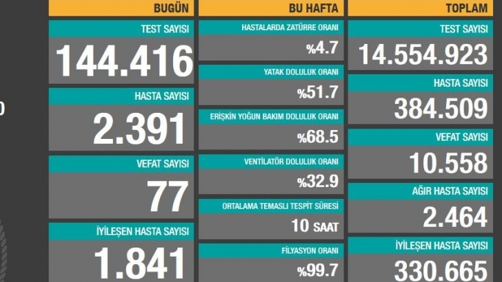 <p>Verilere ilişkin açıklamalarda bulunan Sağlık Bakanı Koca, "Salgının kontrol altında tutulması teması azaltmadan mümkün değil" ifadesini kullandı.</p> <p>Sağlık Bakanı Fahrettin Koca, corona virüsü salgını nedeniyle yaşanan yeni can kaybını ve hasta sayısını açıkladı.</p> <p>Tabloya göre son 24 saatte 77 kişi corona virüsünden hayatını kaybetti, toplam can kaybı 10 bin 558’e yükseldi.</p> <p>Bugün toplam 144 bin 416 test yapılırken, 2 bin 391 yeni tanı konuldu. Toplam hasta sayısı 384 bin 509 oldu.</p> <p>Bugün iyileşen bin 841 kişiyle birlikte toplam iyileşen toplam hasta sayısı 330 bin 665’e yükseldi.</p> <p>Toplam hastalarda zatürre oranının yüzde 4.7, toplam ağır hasta sayısının ise 2 bin 464 olduğu açıklandı.</p> <p>Türkiye genelinde yatak doluluk oranı yüzde 51.7, erişkin yoğun bakım doluluk oranı yüzde 68.5 ve ventilatör doluluk oranı yüzde 32.9 olarak duyuruldu.</p>