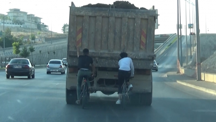 <p>Gaziantep İpek yolunda bisikletli iki genç, uzun süre bir hafriyat kamyonuna tutunarak ilerledi. Canlarını hiçe sayan gençler, kamyon şoförünün kendilerini fark ederek durması üzerine büyük panik yaşadı. Hızla kamyondan uzaklaşan gençler, ters yöne girerek kaçtı. Kazaya davetiye çıkaran gençler, yoğun trafikte ters şeritte ilerleyerek gözden kayboldu </p>