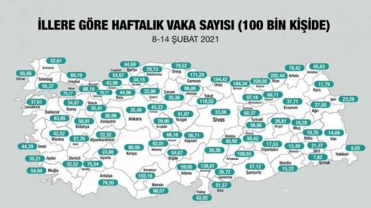 <p>Her 100 bin kişide illere göre haftalık (8-14 Şubat) Covid-19 vaka sayısı şöyle:</p>