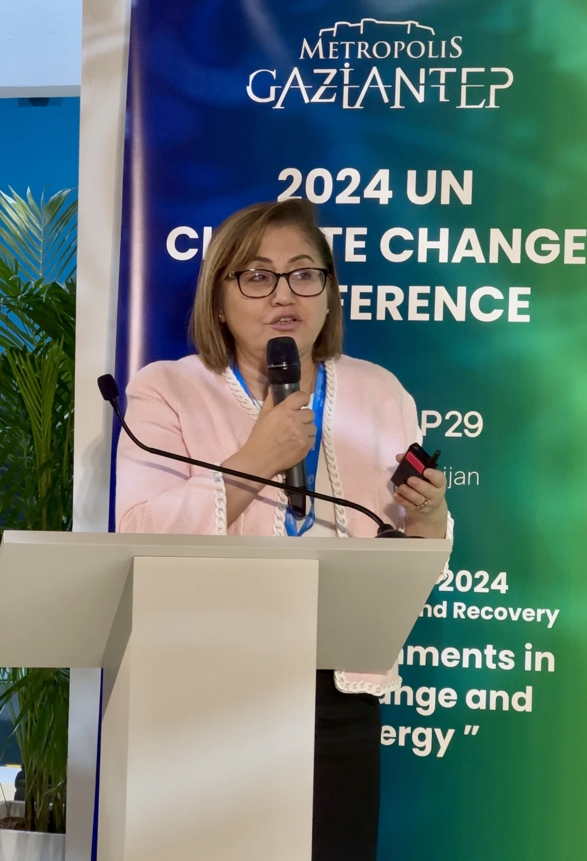 Gaziantep Büyükşehir Belediye Başkanı Fatma Şahin, Azerbaycan’ın başkenti Bakü’de düzenlenen Birleşmiş Milletler İklim Değişikliği Çerçeve Sözleşmesi 29’uncu Taraflar Konferansı’nda (COP29), Gazi şehirde Büyükşehir Belediyesi’nin başarılı çevre yatırımlarını anlattı.