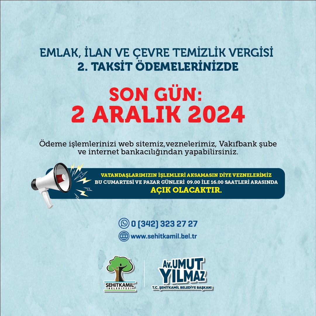 Şehitkamil Belediyesi, emlak, ilan ve çevre temizlik vergisi 2. taksit ödeme süresinin 02 Aralık Pazartesi tarihinde sona ereceğini bildirdi. Vatandaşların herhangi bir aksaklık ile karşılaşmamaları için belediye veznelerinin 30 Kasım Cumartesi-01 Aralık Pazar günleri 09.00 ile 16.00 saatleri arasında açık olacağı duyuruldu.