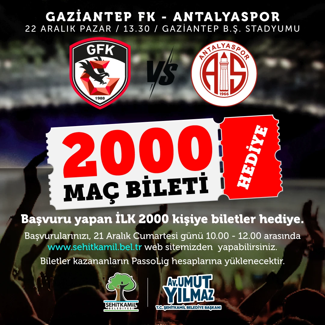 Yılmaz, son haftalarda taraftarın da desteğiyle alt sıralardan kurtulan kırmızı siyahlıların Antalyaspor'u konuk edeceği maçta 2 bin taraftara bilet hediye edeceklerini müjdeledi. Yılmaz, “Şehrimizin marka değeri Gaziantep FK, bu hafta Antalyaspor ile mücadele edecek. Her maç olduğu gibi bu karşılaşmada da takımımızın yanında olacağız. Başvuru yapan 2 bin taraftarımıza bilet hediye edeceğiz. Taraftarlarımız, başvurularını 21 Aralık Cumartesi günü 10.00-12.00 saatleri arasında www.sehitkamil.bel.tr adresi üzerine yapabilecekler. Tüm taraftarlarımızı takımımızın yanında yer almaya davet ediyorum” dedi.