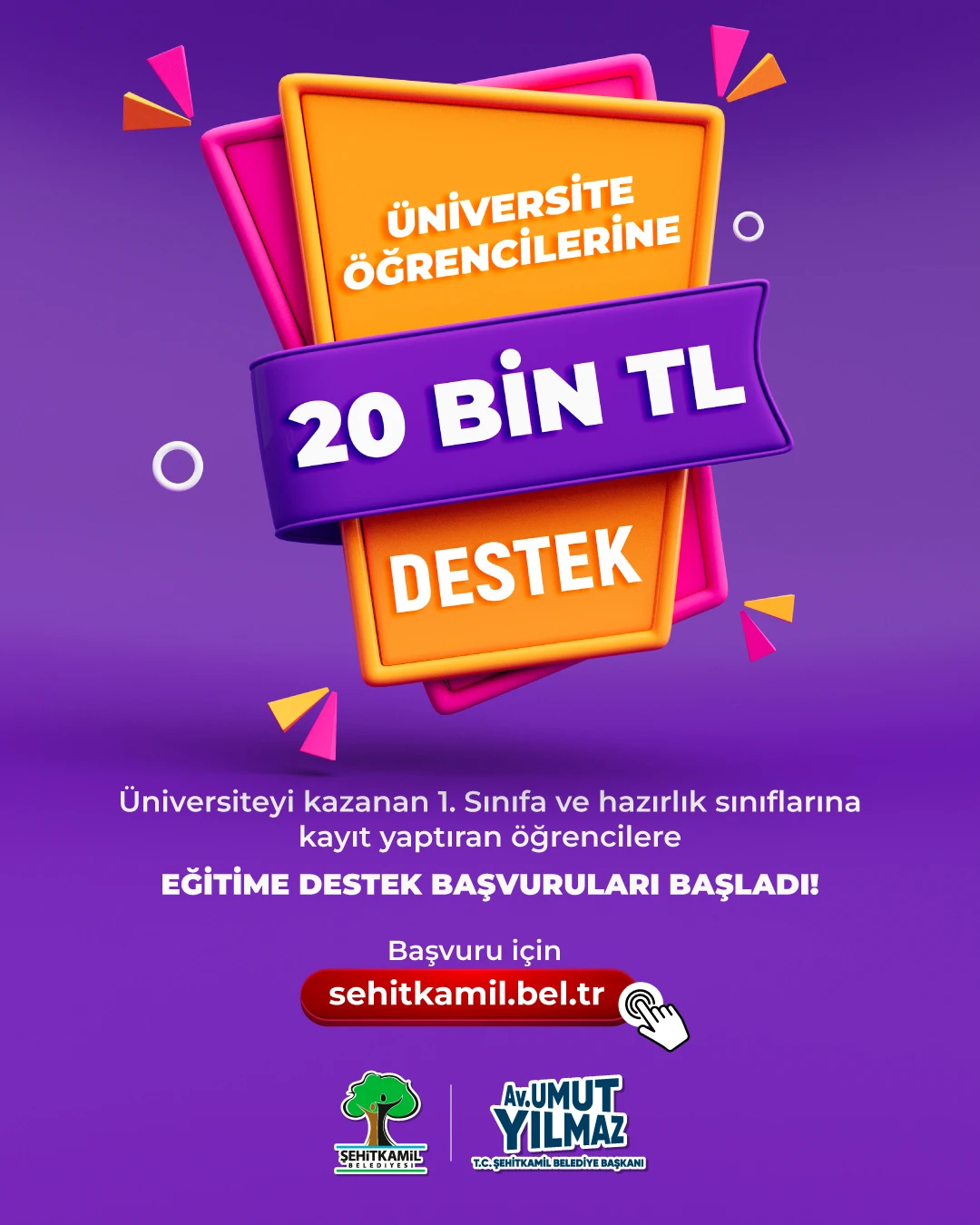 Şehitkamil Belediye Başkanı Umut Yılmaz, üniversiteye kayıt yaptıran öğrencilere bu yıl da desteğini sürdürdü. Yılmaz, hazırlık ya da birinci sınıfa kayıp yaptıran öğrencilere 20 bin TL’lik destek vereceklerini duyurdu.