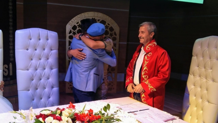 <p>Gaziantepli Fatmanur Özhelvacı ve Halit Can Kaya çifti evlenmek için Şahinbey Belediyesine müracaat etti. Çiftin bu mutluluğunu Şahinbey Belediye Başkanı Mehmet Tahmazoğlu da paylaştı. Nikahı kıymak için nikah masasını oturan Başkan Tahmazoğlu, çiftle bir süre sohbet etti. Başkan Tahmazoğlu, damat Halit Can'a kaç kardeş olduklarını sordu. Soru üzerine damat 4 erkek kardeşinin daha olduğunu söylerken, 3 kardeşinin nikaha katıldığını ama Artvin'de vatani görevini yapan kardeşinin izin alamaması nedeniyle nikaha gelemediğini kaydetti. <br /><br /><strong>Asker kardeşten sürpriz </strong></p> <p>Çifte sürpriz için hazırlıklar tamamlandığında ise Başkan Tahmazoğlu, askerdeki kardeş gelmeden nikahı kıymayacağını söyledi. Bunun üzerine çift büyük bir şok yaşadı. Daha sonra Artvin'den gelen asker Zafer Kaya salona girdi. Bir anda askeri kıyafetli kardeşini gören damat Halit Can Kaya, ikinci bir şok daha yaşadı. Önce büyük şaşkınlık yaşayan damat ardından ise kardeşi Zafer Kaya'ya sarılarak hasret giderdi.  <br />Asker ve ailenin hasret gidermesinin ardından nikah merasimi kaldığı yerden devam etti. Çifte sevinç yaşayan çiftin nikahları Başkan Tahmazoğlu tarafından kıyıldı. Çifte evlilik cüzdanını veren Tahmazoğlu, mutlu, huzurlu ve bereketli bir ömür geçirmeleri temennisinde bulundu </p>