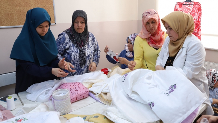 <p style="font-weight: 400;">Çeyizlik nakış ve benzeri işleri öğrenen kadınlar, bir taraftan çocukları için çeyiz hazırlarken, diğer taraftan da yapmış oldukları ürünleri satarak aile bütçesine katkıda bulunuyor.</p>