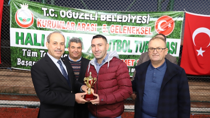 <p style="font-weight: 400;">17 takımın katıldığı turnuvada Oğuzeli Belediyesi birinci, Körkün Esnaf Spor ikinci, Oğuzeli Meslek Yüksek Okulu ise üçüncü oldu.</p> <p style="font-weight: 400;">Dereceye giren takımlar kupa ve madalyalarını Oğuzeli Kaymakamı Batuhan Bingöl, Oğuzeli Belediye Başkanı Mehmet Sait Kılıç, Oğuzeli Meslek Yüksek Okulu Müdürü Murat Karahan, Tüm Spor Adamları Genel Başkanı Vakıf Demir, Tüm Spor Adamları Genel Başkan Yardımcısı Enver Bal, Oğuzeli Gençlik Hizmetleri ve Spor Müdürü Burak Şevket Taş, Oğuzeli Belediye Başkan Yardımcıları Yusuf Taşdemir ve Niyami Özada’nın ellerinden aldı.</p> <p style="font-weight: 400;"><strong>“BU TÜR TURNUVALARIN DEVAMINI SAĞLAYACAĞIZ”</strong></p> <p style="font-weight: 400;">Oğuzeli’nde sporun gelişmesi için ellerinden gelen tüm gayreti gösterdiklerinin altını çizen Oğuzeli Belediye Başkanı Mehmet Sait Kılıç, “Sporun olduğu yerde barış ve kardeşlik vardır” dedi.</p> <p style="font-weight: 400;">Başkan Kılıç, “Her yıl düzenlemiş olduğumuz Kurumlar Arası 5. Geleneksel Halı Saha Futbol Turnuvası sona erdi. Dereceye giren takımlarımıza kupa ve madalyalarını takdim ettik. Bu tür turnuvaları kurumlar arası ilişkilerin güçlenip, pekişmesi için düzenliyoruz. Spor yapmak hem vücudun zinde olmasını hem kaynaşmayı hem de bir araya gelmeyi sağlıyor. İlçe olarak sporda iyi bir noktaya doğru gidiyoruz. Gerek takım sporlarında gerekse bireysel sporlarda iyi durumdayız. Yaptığımız organizasyonlar ile daha da iyi duruma geleceğiz.</p> <p style="font-weight: 400;">Bu organizasyonumuza katılan 17 takımda bu turnuvanın şampiyonudur. Kardeşlik duyguları içinde yapılan maçlarda tüm futbolcularımızı tebrik ediyorum. Oğuzeli Belediyesi olarak bu tür turnuvaların devamını sağlayacağız" ifadelerini kullandı. </p>