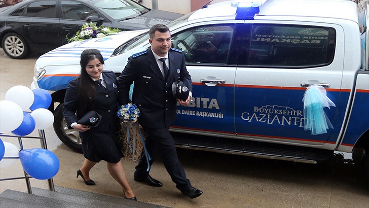 <p>Zabıta memuru Hilal Ayas ile Orhan Aknacar çifti için Zabıta Daire Başkanlığında nikah merasimi düzenlendi. Çiftin nikahı alışılmışın dışında bir törenle kıyıldı. Nikah elbisesi yerine zabıta üniformaları giyen çift gelin arabası yerine ise zabıta aracını kullandı. Çalıştıkları iş yerine gelen çifti Büyükşehir Belediye Başkanı Fatma Şahin, kapıda karşıladı. Çalışma arkadaşlarının alkışlarıyla merasim alanına gelen çift, burada kıyılan nikahla dünya evine girdi.<br />Gaziantep Büyükşehir Belediye Başkanı Şahin tarafından çiftlerin nikahı kıyılırken, çiftlerin şahitliğini ise Büyükşehir Belediyesi Genel Sekreter Yardımcısı Fikret Tural, Büyükşehir Belediyesi Zabıta Daire Başkanı Mehmet Salih Yıldırım, Büyükşehir Belediyesi Zabıta Şube Müdürü Ökkeş Zehiroğlu ve İl Ticaret Müdürü Bilal Yazıcı yaptı. </p>