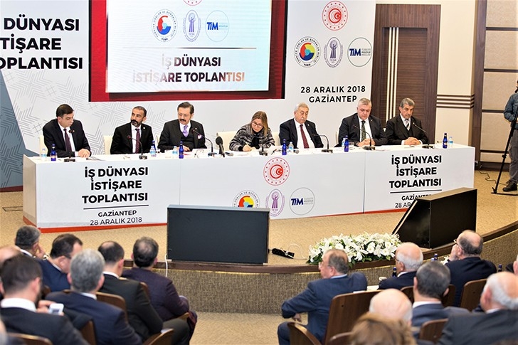 <p>Gaziantep Ticaret Odası, Gaziantep Sanayi Odası ve Gaziantep Ticaret Borsası organizasyonunda GTO Toplantı salonunda gerçekleştirilen “İş Dünyası İstişare Toplantısına” Ticaret Bakanı Ruhsar Pekcan’ın yanı sıra TOBB Başkanı M.Rifat Hisarcıklıoğlu, TESK Başkanı Bendevi Palandöken ve Eximbank Genel Müdürü Adnan Yıldırım da katıldı. <br />Ticaret Bakanı Ruhsar Pekcan, iş dünyası temsilcileri, bölgedeki oda ve borsaların başkanları ve üyeleri ile Gaziantep Ticaret Odasında bir araya gelerek ekonomik durum değerlendirmesi yaptı. İş dünyasının 2019’a ilişkin beklentilerini dinleyen Pekcan yaptığı konuşmada, Cumhurbaşkanlığı Hükümet Sistemiyle beraber 3 bakanlığın birleşmesiyle Ticaret Bakanlığı'nın oluşturulduğunu, bu sayede de geçmişte çok uzun sürelerde alınan kararların artık 5 dakika gibi kısa süreye inen toplantılar halinde alınabildiğini söyledi. Türkiye'nin önümüzdeki 10 yılda temel hedefinin "yüksek gelirli ülkeler" ligine yükselmek olduğunu belirten Pekcan, bunun tek yolunun da üretilen ve dünya pazarlarına sunulan ürünlerin teknoloji, tasarım ve marka içeriğinin seviyesini yükseltmekten geçtiğini vurguladı. </p>
