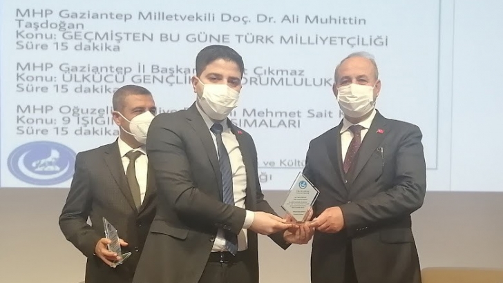 <p style="font-weight: 400; text-align: justify;">Gerçekleşen çalıştay sonrası Ülkü Ocakları İl Başkanı Hakan Demirkan, Prof. Dr. Hikmet Yıldırım Celkan, Gaziantep Milletvekilleri Sermet Atay, A. Muhittin Taşdoğan, Milliyetçi Hareket Partisi Gaziantep İl Başkanı Cahit Çıkmaz ve Oğuzeli Belediye Başkanı Mehmet Sait Kılıç’a katkılarından dolayı plaket takdim etti.</p>