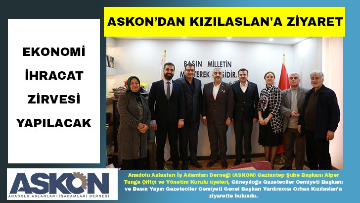 <p>Anadolu Aslanları İş Adamları Derneği (ASKON) Gaziantep Şube Başkanı Alper Tunga Çiftçi ve Yönetim Kurulu üyeleri, Güneydoğu Gazeteciler Cemiyeti Başkanı ve Basın Yayın Gazeteciler Cemiyeti Genel Başkan Yardımcısı Orhan Kızılaslan’a ziyarette bulundu. ASKON Şube Başkanı Çiftçi, ziyarette yaptığı konuşmada, “Gaziantep, geçmişi ve tarihi olan bir şehir olmakla birlikte ekonomi ve sanayi şehri. Biz İpekyolu’nun Gaziantep’e kattığı ekonomik katkının ne kadar olduğunu akademik bir çalıştayla ortaya koyacağız. Çalıştayı üniversite hocalarımızla, akademisyenlerle birlikte yaparak sonuç bildirgesini de programın sonunda kamuoyu ile paylaşacağız” dedi.</p>