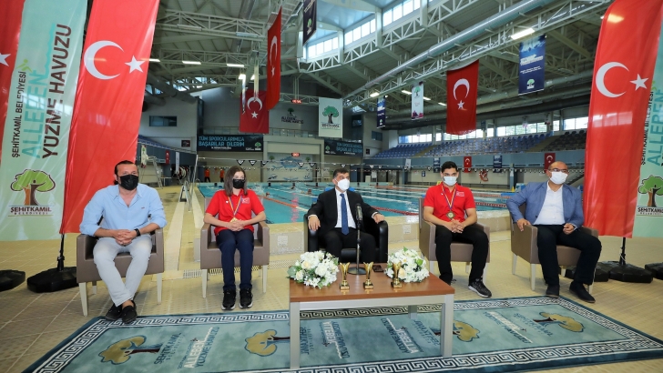 <p style="text-align: justify;">Multinations Gençler ve Yıldızlar Yüzme Şampiyonası’nda, Milli Takım kadrosunda yer alan ve organizasyon kapsamında gerçekleştirilen yarışları kulvarlarda gösterdikleri üst düzey performansla 1 rekor, 3 altın ve 2 gümüş madalya ile tamamlayan Şehitkamil Belediye Spor Kulübü’nün milli kulaçları Beril Öztürk, Kaan Kara ve antrenörleri Ali Göz, Alleben Yüzme Havuzunda altyapı sporcuları, yüzme branşı antrenörleri ve sporcu velilerinin katılımıyla gerçekleştirilen törende Şehitkamil Belediye Başkanı Rıdvan Fadıloğlu tarafından ödüllendirildiler. Yüzme branşı adına ilklere imza atan altın kulaçların yaşadıkları haklı gurur ve sevinçleri, program süresi boyunca gözlerinden okundu.</p>