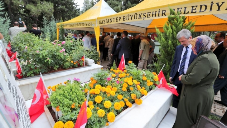 <p style="font-weight: 400;">15 Temmuz Demokrasi ve Milli Birlik Günü programı kapsamında Asri Mezarlık ve Yeşilkent Mezarlığı'ndaki şehitlikler ziyaret edildi. Gaziantep Valisi Davut Gül, Büyükşehir Belediye Başkanı Fatma Şahin, İl Jandarma Komutanı Halil Uysal, İl Emniyet Müdürü Faruk Karaduman, Şahinbey Belediye Başkanı Mehmet Tahmazoğlu, Şehitkamil Belediye Başkanı Rıdvan Fadıloğlu, kurum müdürleri ve askeri erkan tarafından gerçekleştirilen ziyarette Kur'an-ı Kerim okundu ve dualar edildi. Şehitlerin mezarlarına karanfiller bırakan protokol üyeleri, şehit yakınlarına başsağlığı diledi.</p>