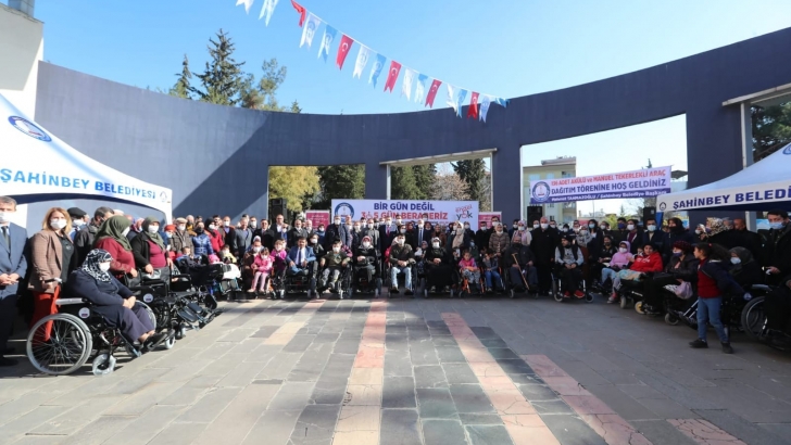 <p style="font-weight: 400; text-align: justify;">Herkesin birer engelli adayı olduğuna dikkat çeken Şahinbey Belediye Başkanı Mehmet Tahmazoğlu, “3 Aralık Dünya Engelliler Günü münasebetiyle tüm engelli kardeşlerimizin Engelliler Günü’nü kutluyorum. Şahinbey Belediyesi olarak sadece engelliler gününde engelli kardeşlerimizi hatırlamak yerine engelli kardeşlerimize yardımcı olacak çalışmaları da birlikte yürütüyoruz. Sadece törenlerde değil, ihtiyacı olan herkese yıl içerisinde de akülü ve manuel sandalye, beyaz baston, işitme cihazı ve benzeri cihazların dağıtımını gerçekleştiriyoruz. Bugün 136 adet akülü ve manuel sandalye dağıtımı yapıyoruz ama yıl içerisinde dağıttığımız akülü ve manuel sandalyenin sayısı 300’ü geçti. Göreve geldiğimiz günden itibaren de şu ana kadar 2. 762 adet akülü ve manuel sandalye dağıttık. Sosyal devlet olmanın gereği engelli kardeşlerimize sahip çıkmaktır” dedi.</p>