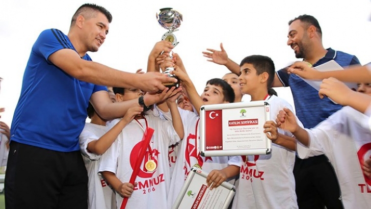 <p class="m_8617628923503491042MsoNoSpacing"><u></u> Yeşil sahada kazananın ve kaybedenin olmadığı, dostluk, barış ve kardeşlik duygularının katılımcı sporculara anlatıldığı, fair play ruhunun pekiştirildiği bir sportif organizasyona daha başarıyla imza atan Şehitkamil Belediyesi, 15 Temmuz Demokrasi ve Milli Birlik Günü etkinlikleri çerçevesinde Türkiye Futbol Adamları Derneği (TÜFAD) Gaziantep Şubesi ile işbirliğiyle organize ettiği futbol turnuvasında yıldız bir futbolcu olma hayali kuran yüzlerce küçük kramponu misafir etti. 10 farklı spor kulübünün katılımıyla gerçekleştirilen organizasyonun ödül töreninde sporcuların ay-yıldızlı şanlı bayrağa olan sevdaları ve 15 Temmuz marşlarını büyük bir coşku ile söylemeleri tribünleri dolduran yüzlerce öğrenci velisinden büyük alkış aldı. Sporun tüm güzelliklerinin yeşil sahaya yansıdığı organizasyonun finalinde birbirinden yetenekli kramponlar ve formasını büyük bir aşkla giydikleri spor kulüpleri, Şehitkamil Belediye Başkanlığınca sportif malzemeler, günün anısına özgü madalya, kupa ve başarı belgeleriyle ödüllendirildi.</p>