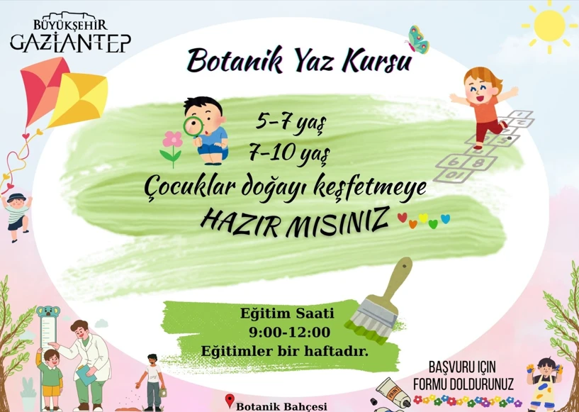 Gaziantep Büyükşehir Belediyesi tarafından çocuklara özel yaz etkinliği düzenleniyor. Gaziantep Botanik Bahçesi’nde çocuklar doğanın büyülü dünyasına eğlenceli bir yolculuğa katılıyor. Saat 09.00 ve 12.00 arası her hafta farklı doğa temasının yer alacağı, belirli yaş gruplarına göre düzenlenen etkinliklerle çocuklar bitkileri tanıyacak, doğayı gözlemleyecek, eğlenceli atölyelere katılacak.