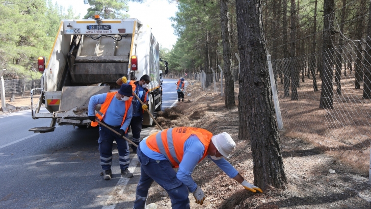 <p style="font-weight: 400; text-align: justify;">Yangın esnasında ateşlerin yayılma olasılığını artıracak kozalaklar bir bir toplanıyor, yol kenarları temizleniyor.</p>