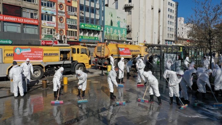<p style="font-weight: 400;">Gaziantep Büyükşehir Belediyesi tarafından Corona Virüs (COVID-19) salgınına karşı mücadele kapsamında başlatılan dezenfekte ve ilaçlama çalışmaları genişletilerek il genelinde insan yoğunluğunun fazla olduğu; ana caddeler, parklar, meydanlar ve boş arsalar 11 ekip, 15 araç ve 240 temizlik personeliyle temizlenmeye başlandı.</p>