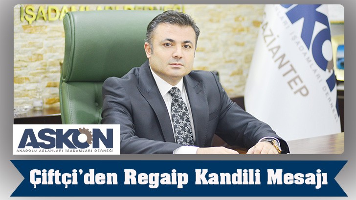 <p>Anadolu Aslanları İş Adamları Derneği (ASKON) Gaziantep Şube Başkanı Alper Tunga Çiftçi, Regaip Kandili dolayısıyla bir mesaj yayınladı.</p> <p> Başkan Alper Tunga Çiftçi, yayınladığı Regaip Kandili mesajında, “İslam aleminin "Üç Aylar" diyerek özel bir önem verdiği ve Yüce Allah’ın insanlara rahmet ve nimetlerini çokça ihsan ettiği Recep, Şaban ve Ramazan aylarının taçlanacağı Regaip Kandili’ne bir kez daha ulaşmış olmanın huzurunu ve mutluluğunu hep birlikte yaşıyoruz. Bu özel günlerde, dua ve niyazlarımızı artırmalı, kendimizi bulma ve bilmenin, imkanını yakalamalıyız. Komşuluk, akrabalık, kardeşlik ve aile bağları gibi toplumumuz için çok önemli olan birliktelik duygularımızın artmasına çabalamalıyız” dedi.</p> <p> Çiftçi, mesajının devamında şu ifadeleri kullandı:</p> <p> Bu duygu ve düşüncelerle, ülkemizin, milletimizin, hemşerilerimin ve tüm İslam aleminin üç aylar ve Regaip Kandilini tebrik eder, hayırlara vesile olmasını, bütün insanlığa rahmet, mağfiret, sevgi ve huzur getirmesini, milletçe birlik ve beraberlik içinde daha nice kandillere kavuşmayı Cenab-ı Hak’tan niyaz ederim.”</p>