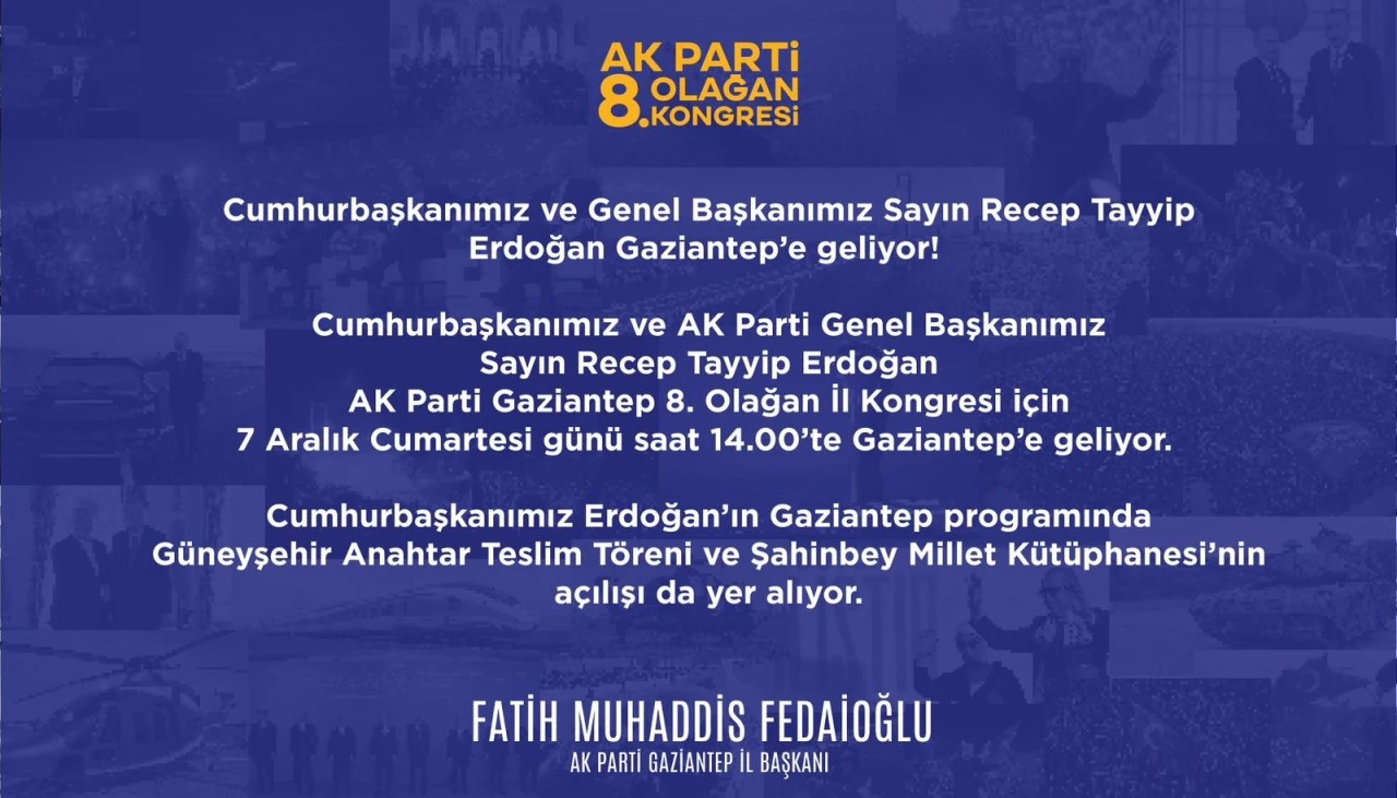 Kongresi için 7 Aralık Cumartesi günü Gaziantep’e geliyor. Cumhurbaşkanı Erdoğan’ın Gaziantep