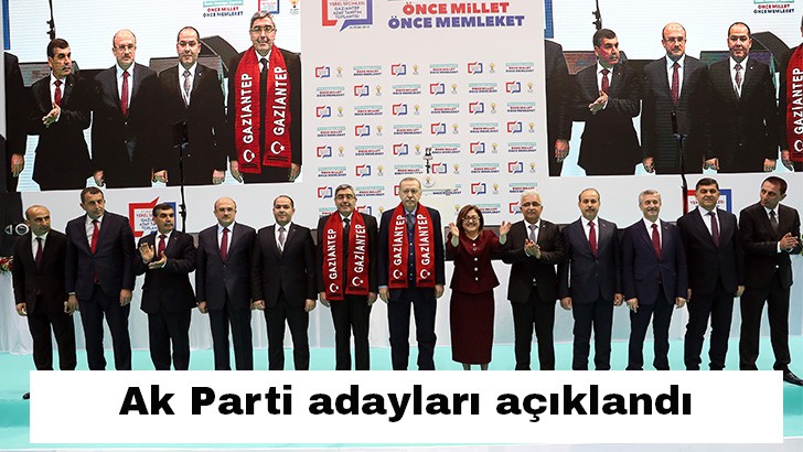 <p>Cumhurbaşkanı Recep Tayyip Erdoğan Gaziantep'in belediye başkan adaylarını açıkladı. </p> <p>Cumhurbaşkanı Recep Tayyip Erdoğan, Karataş Spor Salonunda düzenlenen toplantıda partisinin Gaziantep Büyükşehir Belediyesi ve ilçe belediye başkan adaylarını açıkladı. <br />Gaziantep’in Belediye Başkan adayları <br />- Gaziantep Büyükşehir Belediye Başkan adayı: Fatma Şahin <br />- Şahinbey ilçe Belediye Başkan adayı: Mehmet Tahmazoğlu <br />- Şehitkamil ilçe Belediye Başkan adayı: Rıdvan Fadıloğlu <br />- Araban ilçe Belediye Başkan adayı: Mehmet Özdemir <br />- Islahiye İlçe Belediye Başkan adayı: Kemal Vural <br />- Nizip ilçe Belediye Başkan adayı: Mehmet Sarı <br />- Nurdağı ilçe Belediye Başkan adayı: Ökkeş Kavak <br />- Yavuzeli İlçe Belediye Başkan adayı: Mustafa kemal sakaroğlu <br />- Oğuzeli ilçe Belediye Başkan adayı: (Cumhur ittifakı) Mehmet Sait Kılıç <br />- Karkamış ilçe Belediye Başkan adayı: (Cumhur ittifakı) Mehmet Seydi Yılmaz </p>