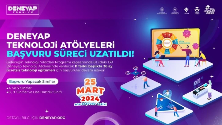 Deneyap Teknoloji Atölyeleri, Türkiye'nin geleceğini şekillendiren yetenekli gençleri geleceğe hazırlamaya devam ediyor. Ülkenin dört bir yanında, Edirne'den Kars'a kadar 81 ilde bulunan 139 Deneyap Teknoloji Atölyesi, binlerce öğrenciye farklı alanlarda eğitim imkanı sunuyor. Robotik ve Kodlamadan Nanoteknolojiye, Tasarım ve Üretimden Yapay Zekaya kadar geniş bir yelpazede 11 farklı eğitim programıyla gençlerin teknolojiye olan ilgilerini ve yeteneklerini keşfetmelerine olanak sağlıyor. "Teknoloji Üreten Bir Türkiye" mottosuyla yola çıkan ve Milli Teknoloji Hamlesi'nin önemli bir parçası olarak görülen Deneyap Teknoloji Atölyeleri, geleceğin teknoloji liderlerini yetiştirmeye aday gençler için 7 Şubat'ta başlayan başvuru sürecini 25 Mart tarihine kadar uzatmıştır.
