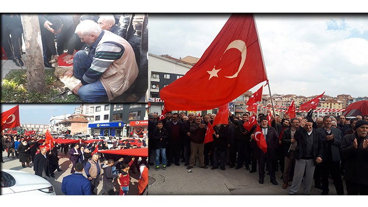 <p>Ankara’nın Mamak ilçesine bağlı olan Akdere Mahalle sakinleri, mahalle muhtarı Nizam Açıkgöz’ün çağrısıyla, meydanda toplandı. Mehter takımı eşliğinde Afrin'de görev yapan askerlere selam gönderen vatandaşlar, Mehmetçik için dualar etti. Ayrıca alanda şehitler için de gıyabi cenaze namazı kılındı. <br />Çok sayıda Mamaklı, ilçenin sokaklarında Türk bayrakları ile tekbirler eşliğinde yürüyerek, "Kahrolsun PKK", "Askere uzanan eller kırılsın", "Şehitler ölmez vatan bölünmez" sloganları attı. Ankara Askeralma Bölge Başkanlığı önüne gelen vatandaşlar, saygı duruşu ve İstiklal Marşı'nın okunmasının ardından tekbirler eşliğinde Mehmetçik için kurban kesti.<br /><br /><strong>"15 bin kişi Afrin’e gitmek için hazır"</strong></p>