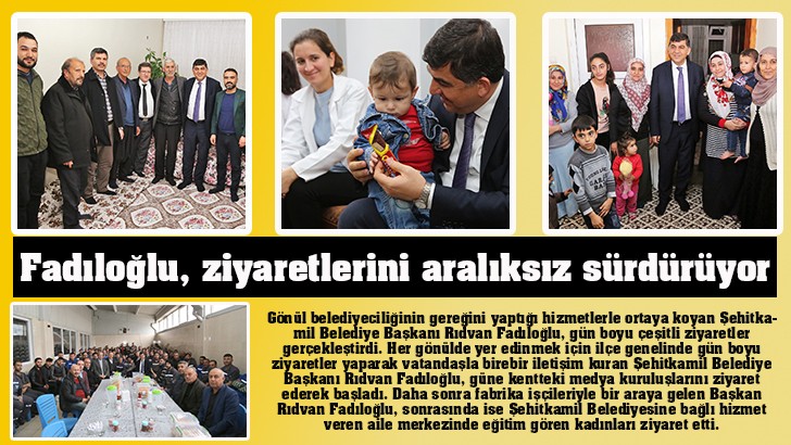 <p>Gönül belediyeciliğinin gereğini yaptığı hizmetlerle ortaya koyan Şehitkamil Belediye Başkanı Rıdvan Fadıloğlu, gün boyu çeşitli ziyaretler gerçekleştirdi.</p> <p>Her gönülde yer edinmek için ilçe genelinde gün boyu ziyaretler yaparak vatandaşla birebir iletişim kuran Şehitkamil Belediye Başkanı Rıdvan Fadıloğlu, güne kentteki medya kuruluşlarını ziyaret ederek başladı. Daha sonra fabrika işçileriyle bir araya gelen Başkan Rıdvan Fadıloğlu, sonrasında ise Şehitkamil Belediyesine bağlı hizmet veren aile merkezinde eğitim gören kadınları ziyaret etti. Alleben Yüzme Havuzları Aile Birliği temsilcileri ile Türkiye Şampiyonasında Gaziantep’i temsil eden sporcuların velileriyle buluşan Başkan Fadıloğlu, sohbet ortamında samimi bir söyleşi gerçekleştirdi. Farklı mahallelere taziye ziyaretleri yapan Başkan Fadıloğlu, günü aile ziyaretleri yaparak tamamladı. </p>