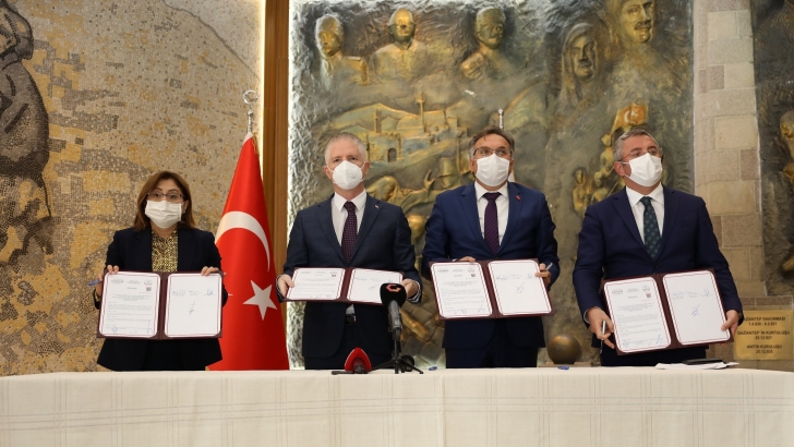 <p style="font-weight: 400; text-align: justify;">Protokol imza töreni sonrasında GBB Başkanı Fatma Şahin, Vali Davut Gül, İl Milli Eğitim Müdür Yardımcısı Mehmet Ali Tiryakioğlu ve Yatırım İzleme ve Koordinasyon Başkanı Muhammet Önder günün anısına toplu fotoğraf çektirdi.</p>