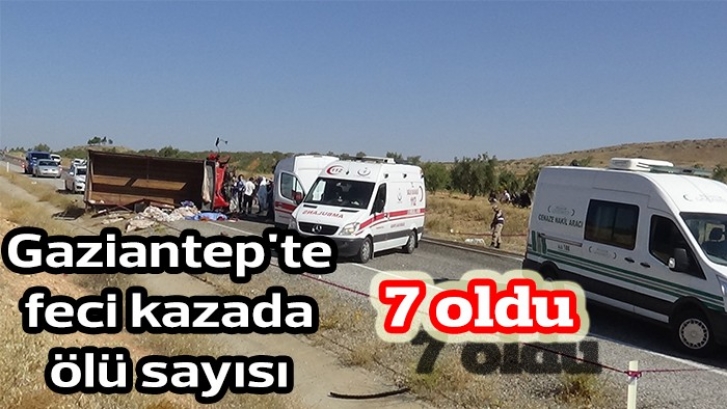 <p>Gaziantep'te feci kazada ölü sayısı 7'ye yükseldi. Yaralanan 19 kişiden 6'sının da durumunun ağır olduğu belirtildi. </p> <p>Gaziantep-Elbeyli karayolu Kayacık Barajı yakınlarında tarım işçilerini taşıyan kamyonetin minibüsle çarpıştığı kazada ölü sayısı 7'ye çıktı. Kazada yaralananlardan 2'si kaldırıldığı hastanelerde hayatını kaybetti. Hastanede ölenlerin de otopsi yapılmak üzere Gaziantep Adli Tıp Kurumuna gönderileceği öğrenildi. Kazada yaralanan 19 kişiden 6'sının da hayati tehlikesinin sürdüğü öğrenildi. </p>
