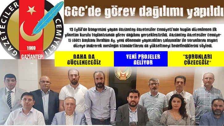 <p>15 Eylül'de kongresini yapan Gaziantep Gazeteciler Cemiyeti'nde bugün düzenlenen ilk yönetim kurulu toplantısında görev dağılımı gerçekleştirildi. Gaziantep Gazeteciler Cemiyeti (GGC) Başkanı İbrahim Ay, yeni dönemde yapacakları çalışmalar ile sorunlarını asgari düzeye indirerek mesleğin standartlarını da yükseltmeyi hedeflediklerini söyledi.</p>