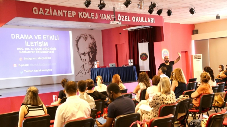 <p style="font-weight: 400; text-align: justify;">Gaziantep Kolej Vakfı Özel Okulları 2021-2022 eğitim-öğretim yılı 1. Dönem Eğitim Planı’nın 2. gününde “ Drama ve Etkili İletişim ” konulu seminer düzenlendi. Gaziantep Kolej Vakfı Özel Okulları Genel Müdürü İsmet Tiryaki, Okul Müdürleri, Bölüm Başkanı ve Öğretmenler katılımları ile pandemi önlemleri dikkate alınarak yapılan seminere, konuşmacı olarak Gaziantep Üniversitesi Eğitim Fakültesi Öğretim Üyesi Doç. Dr. Kaan BÜYÜKİKİZ yer aldı. Büyükikiz “Drama ve Etkili İletişim” konulu sunumda bilgilerini katılımcılarla paylaştı. Söyleşinin son bölümünde öğretmeler konuyla ilgili merak ettikleri soruları konuşmacıya yönelterek karşılıklı görüş alışverişinde bulundular. GKV Özel Okulları Genel Müdürü İsmet Tiryaki söyleşinin sonunda konuşmacı Gaziantep Üniversitesi Eğitim Fakültesi Öğretim Üyesi Doç. Dr. Kaan Büyükikiz’a günün anısına bir teşekkür çiçeği verdi.</p>